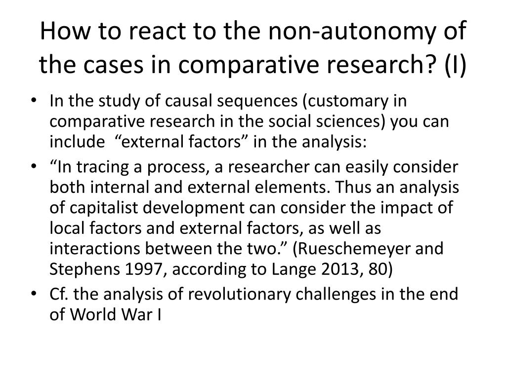 How to react to the non-autonomy of the cases in comparative research? (I) • In the study of causal sequences (customary in comparative research in the social sciences) you can include “external factors” in the analysis: • “In tracing a process, a researcher can easily consider both internal and external elements. Thus an analysis of capitalist development can consider the impact of local factors and external factors, as well as interactions between the two.” (Rueschemeyer and Stephens 1997, according to Lange 2013, 80) • Cf. the analysis of revolutionary challenges in the end of World War I