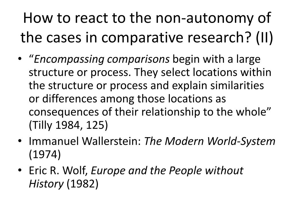 How to react to the non-autonomy of the cases in comparative research? (II) • “Encompassing comparisons begin with a large structure or process. They select locations within the structure or process and explain similarities or differences among those locations as consequences of their relationship to the whole” (Tilly 1984, 125) • Immanuel Wallerstein: The Modern World-System (1974) • Eric R. Wolf, Europe and the People without History (1982)