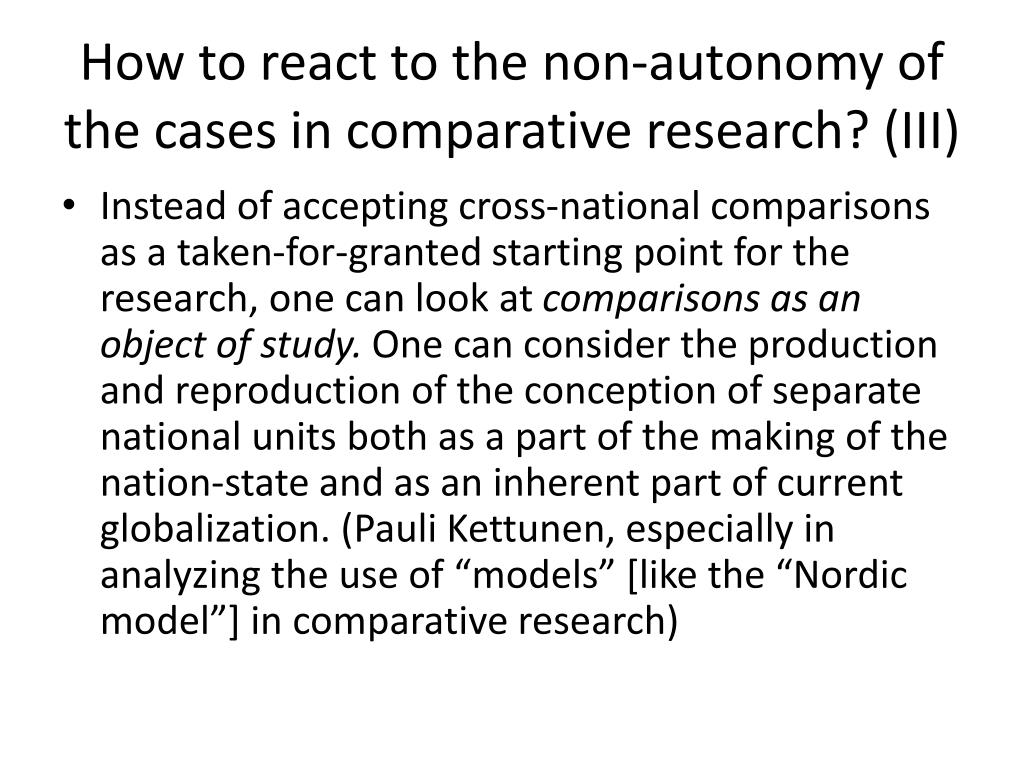 How to react to the non-autonomy of the cases in comparative research? (III) • Instead of accepting cross-national comparisons as a taken-for-granted starting point for the research, one can look at comparisons as an object of study. One can consider the production and reproduction of the conception of separate national units both as a part of the making of the nation-state and as an inherent part of current globalization. (Pauli Kettunen, especially in analyzing the use of “models” [like the “Nordic model”] in comparative research)