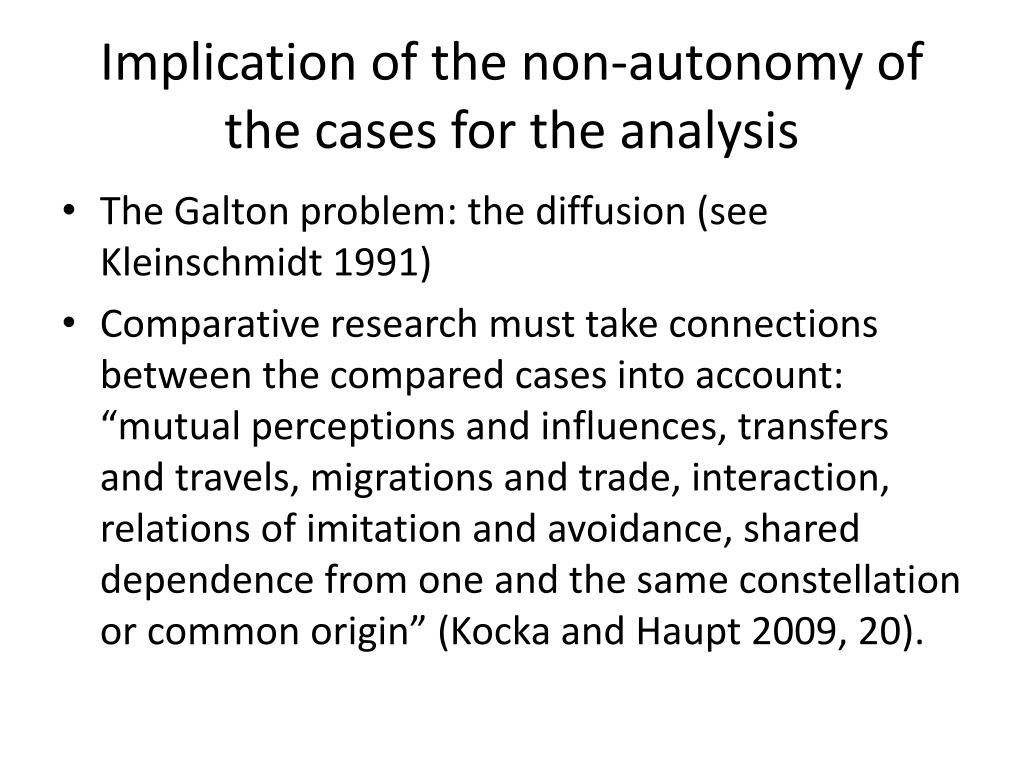 Implication of the non-autonomy of the cases for the analysis • The Galton problem: the diffusion (see Kleinschmidt 1991) • Comparative research must take connections between the compared cases into account: “mutual perceptions and influences, transfers and travels, migrations and trade, interaction, relations of imitation and avoidance, shared dependence from one and the same constellation or common origin” (Kocka and Haupt 2009, 20).