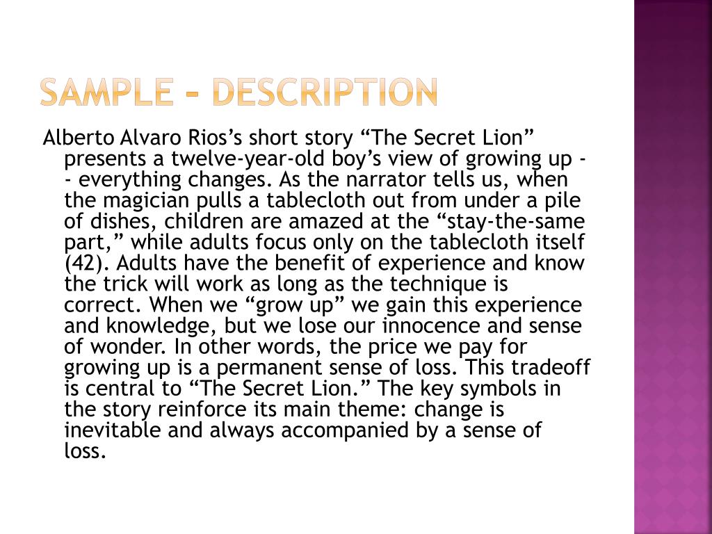 Sample – description Alberto Alvaro Rios’s short story “The Secret Lion” presents a twelve-year-old boy’s view of growing up -- everything changes. As the narrator tells us, when the magician pulls a tablecloth out from under a pile of dishes, children are amazed at the “stay-the-same part,” while adults focus only on the tablecloth itself (42). Adults have the benefit of experience and know the trick will work as long as the technique is correct. When we “grow up” we gain this experience and knowledge, but we lose our innocence and sense of wonder. In other words, the price we pay for growing up is a permanent sense of loss. This tradeoff is central to “The Secret Lion.” The key symbols in the story reinforce its main theme: change is inevitable and always accompanied by a sense of loss.