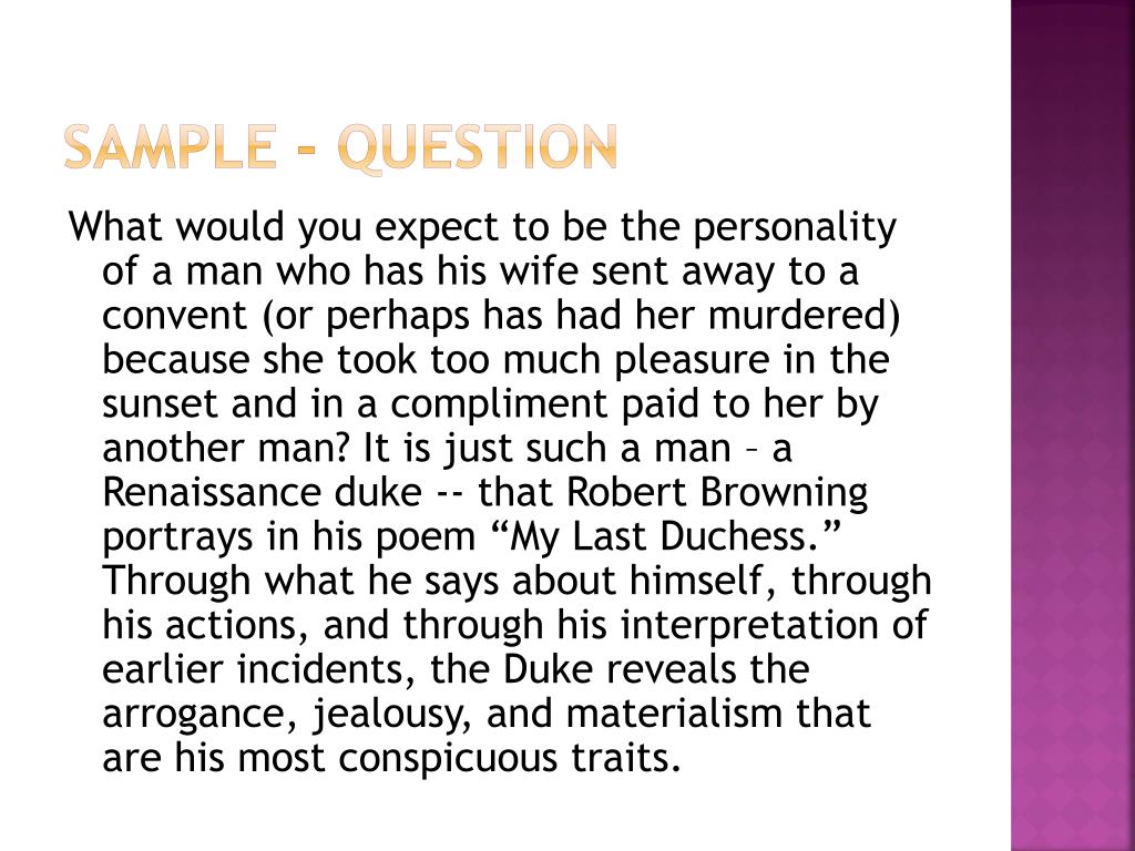Sample - Question What would you expect to be the personality of a man who has his wife sent away to a convent (or perhaps has had her murdered) because she took too much pleasure in the sunset and in a compliment paid to her by another man? It is just such a man – a Renaissance duke -- that Robert Browning portrays in his poem “My Last Duchess.” Through what he says about himself, through his actions, and through his interpretation of earlier incidents, the Duke reveals the arrogance, jealousy, and materialism that are his most conspicuous traits.