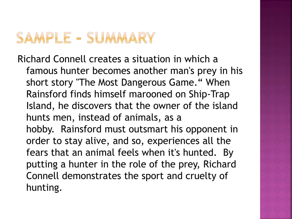 Sample - summary Richard Connell creates a situation in which a famous hunter becomes another man's prey in his short story "The Most Dangerous Game.“ When Rainsford finds himself marooned on Ship-Trap Island, he discovers that the owner of the island hunts men, instead of animals, as a hobby. Rainsford must outsmart his opponent in order to stay alive, and so, experiences all the fears that an animal feels when it's hunted. By putting a hunter in the role of the prey, Richard Connell demonstrates the sport and cruelty of hunting.