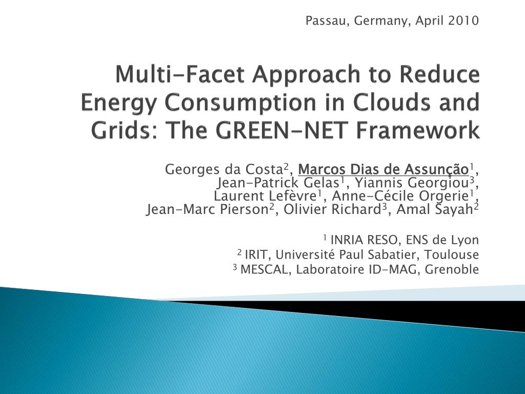 Passau, Germany, April 2010 Multi-Facet Approach to Reduce Energy Consumption in Clouds and Grids: The GREEN-NET Framework Georges da Costa2, Marcos Dias de Assunção1,Jean-Patrick Gelas1, Yiannis Georgiou3,Laurent Lefèvre1, Anne-Cécile Orgerie1,Jean-Marc Pierson2, Olivier Richard3, Amal Sayah2 1 INRIA RESO, ENS de Lyon 2 IRIT, Université Paul Sabatier, Toulouse 3 MESCAL, Laboratoire ID-MAG, Grenoble