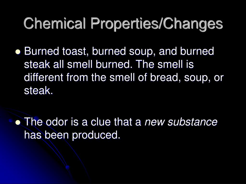 Chemical Properties/Changes • Burned toast, burned soup, and burned steak all smell burned. The smell is different from the smell of bread, soup, or steak. • The odor is a clue that a new substance has been produced.