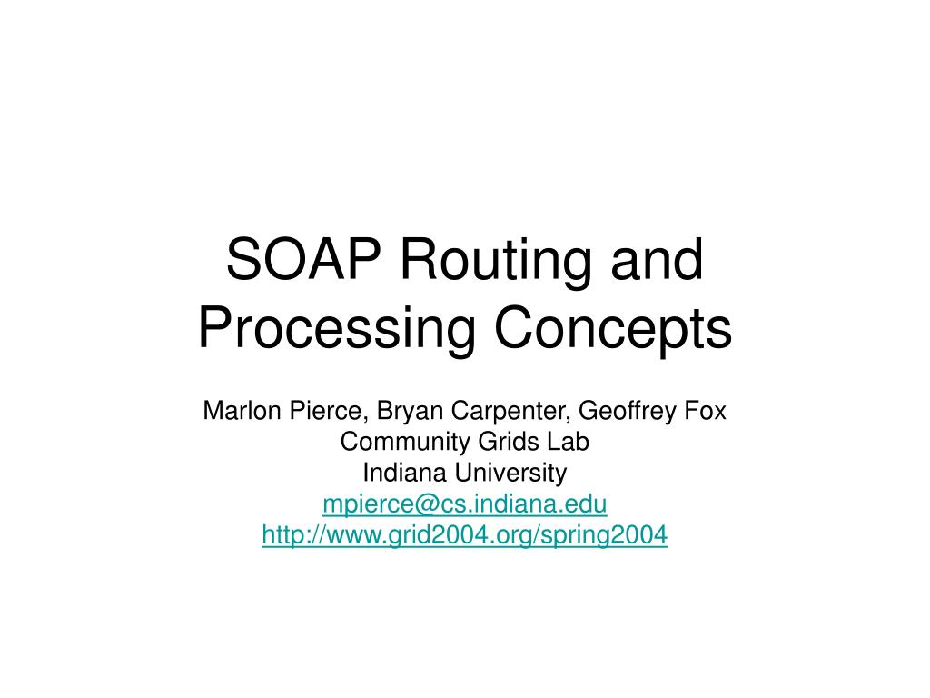 SOAP Routing and Processing Concepts Marlon Pierce, Bryan Carpenter, Geoffrey Fox Community Grids Lab Indiana University mpierce@cs.indiana.edu http://www.grid2004.org/spring2004
