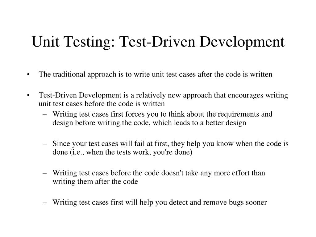 Unit Testing: Test-Driven Development • The traditional approach is to write unit test cases after the code is written • Test-Driven Development is a relatively new approach that encourages writing unit test cases before the code is written • Writing test cases first forces you to think about the requirements and design before writing the code, which leads to a better design • Since your test cases will fail at first, they help you know when the code is done (i.e., when the tests work, you're done) • Writing test cases before the code doesn't take any more effort than writing them after the code • Writing test cases first will help you detect and remove bugs sooner