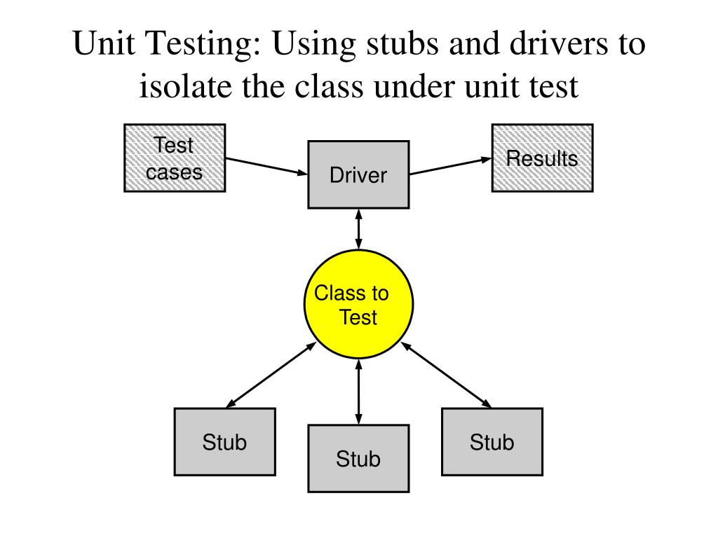 Test Results cases Driver Class to Test Stub Stub Stub Unit Testing: Using stubs and drivers to isolate the class under unit test