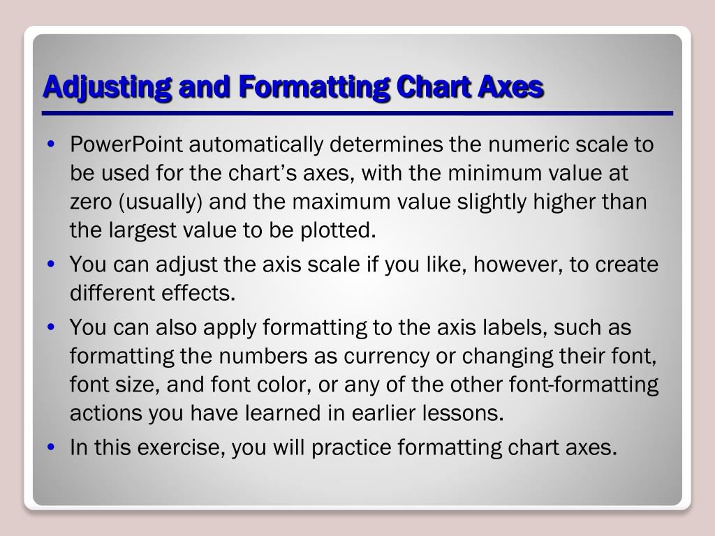 Adjusting and Formatting Chart Axes • PowerPoint automatically determines the numeric scale to be used for the chart’s axes, with the minimum value at zero (usually) and the maximum value slightly higher than the largest value to be plotted. • You can adjust the axis scale if you like, however, to create different effects. • You can also apply formatting to the axis labels, such as formatting the numbers as currency or changing their font, font size, and font color, or any of the other font-formatting actions you have learned in earlier lessons. • In this exercise, you will practice formatting chart axes.