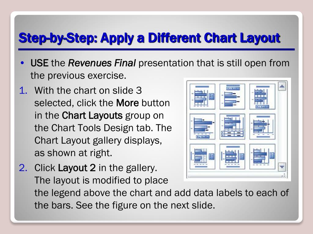 Step-by-Step: Apply a Different Chart Layout • USEthe Revenues Final presentation that is still open from the previous exercise. • With the chart on slide 3 selected, click the More button in the Chart Layouts group on the Chart Tools Design tab. The Chart Layout gallery displays, as shown at right. • Click Layout 2 in the gallery. The layout is modified to place the legend above the chart and add data labels to each of the bars. See the figure on the next slide.