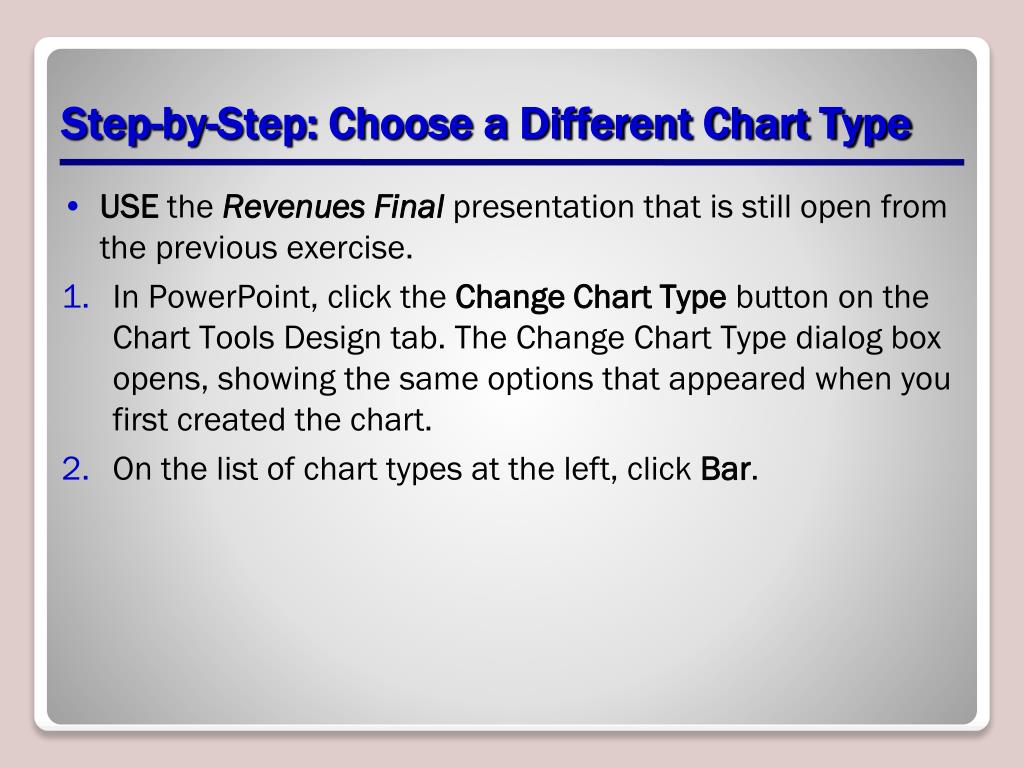 Step-by-Step: Choose a Different Chart Type • USEthe Revenues Final presentation that is still open from the previous exercise. • In PowerPoint, click the Change Chart Type button on the Chart Tools Design tab. The Change Chart Type dialog box opens, showing the same options that appeared when you first created the chart. • On the list of chart types at the left, click Bar.