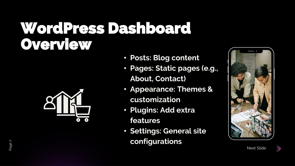 7. WordPress Dashboard Overview • Posts: Blog content • Pages: Static pages (e.g., About, Contact) • Appearance: Themes & customization • Plugins: Add extra features • Settings: General site configurations Page 7 Next Slide