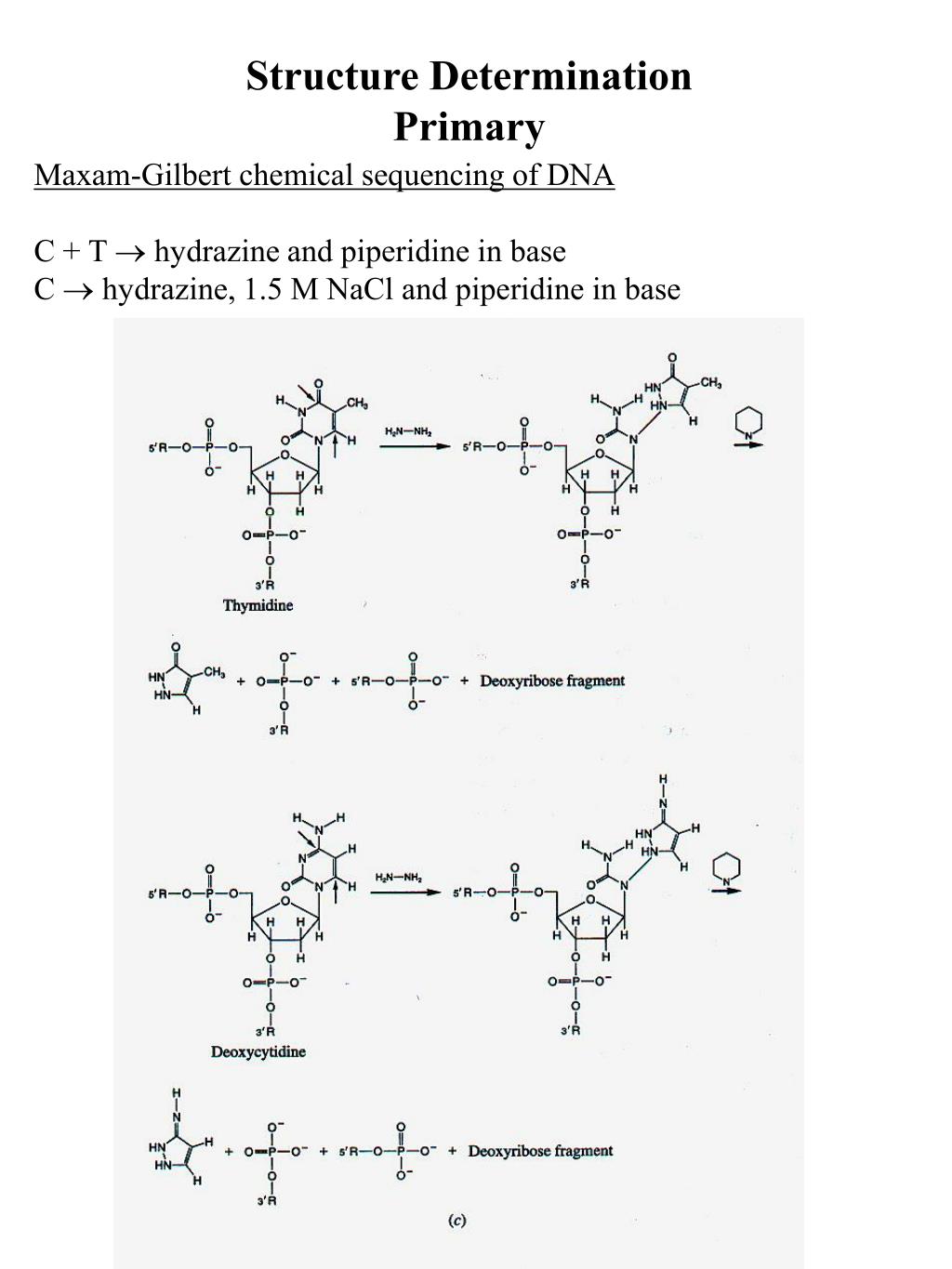 Structure Determination Primary Maxam-Gilbert chemical sequencing of DNA C + T hydrazine and piperidine in base C hydrazine, 1.5 M NaCl and piperidine in base