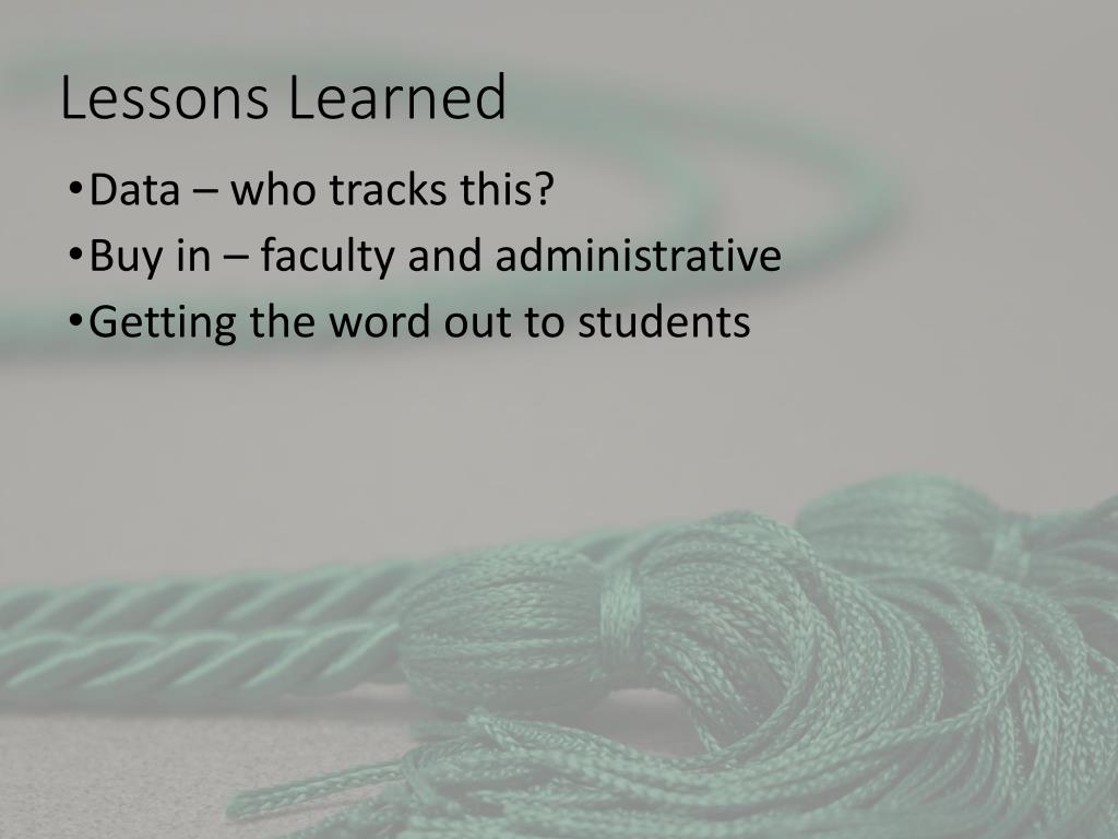 Lessons Learned • Data – who tracks this? • Buy in – faculty and administrative • Getting the word out to students