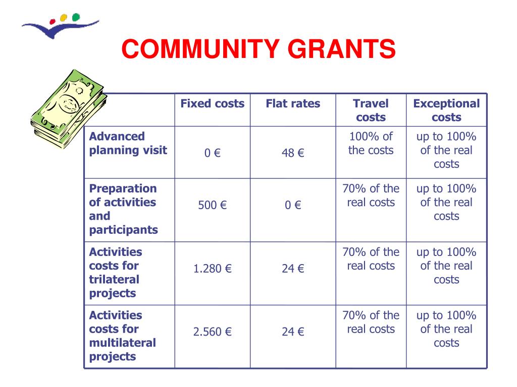 Fixed costs Flat rates Travel costs Exceptional costs Advanced planning visit 0 € 48 € 100% of the costs up to 100% of the real costs Preparation of activities and participants 500 € 0 € 70% of the real costs up to 100% of the real costs Activities costs for trilateral projects 1.280 € 24 € 70% of the real costs up to 100% of the real costs Activities costs for multilateral projects 2.560 € 24 € 70% of the real costs up to 100% of the real costs COMMUNITY GRANTS