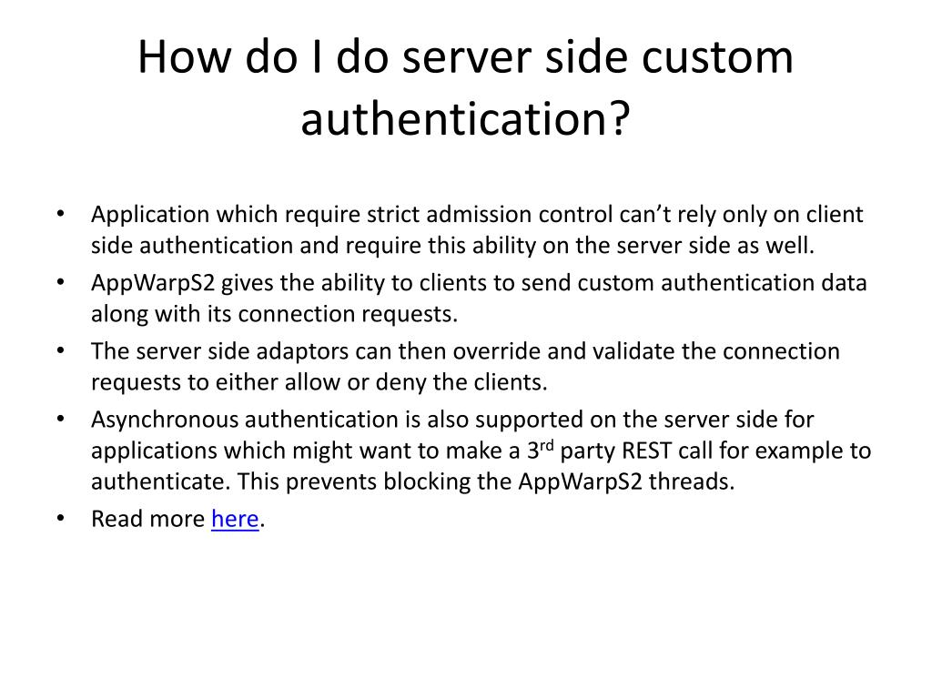 How do I do server side custom authentication? • Application which require strict admission control can’t rely only on client side authentication and require this ability on the server side as well. • AppWarpS2 gives the ability to clients to send custom authentication data along with its connection requests. • The server side adaptors can then override and validate the connection requests to either allow or deny the clients. • Asynchronous authentication is also supported on the server side for applications which might want to make a 3rd party REST call for example to authenticate. This prevents blocking the AppWarpS2 threads. • Read more here.