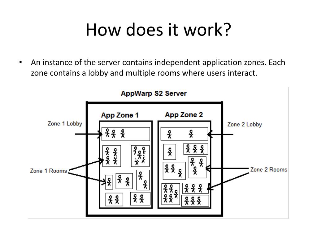 How does it work? • An instance of the server contains independent application zones. Each zone contains a lobby and multiple rooms where users interact.