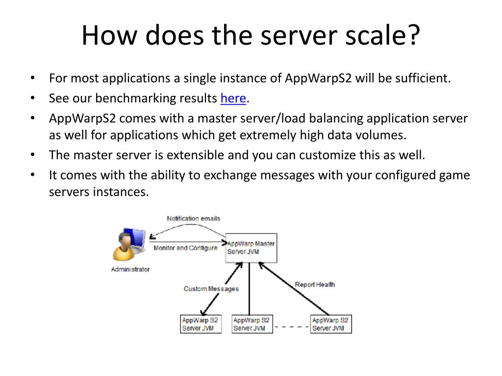 How does the server scale? • For most applications a single instance of AppWarpS2 will be sufficient. • See our benchmarking results here. • AppWarpS2 comes with a master server/load balancing application server as well for applications which get extremely high data volumes. • The master server is extensible and you can customize this as well. • It comes with the ability to exchange messages with your configured game servers instances.
