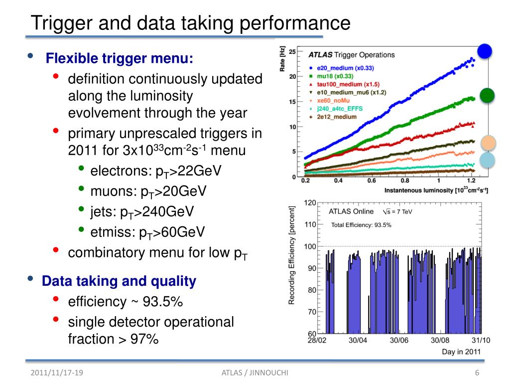 Trigger and data taking performance • Flexible trigger menu: • definition continuously updated along the luminosity evolvement through the year • primary unprescaled triggers in 2011 for 3x1033cm-2s-1 menu • electrons: pT>22GeV • muons: pT>20GeV • jets: pT>240GeV • etmiss: pT>60GeV • combinatory menu for low pT • Data taking and quality • efficiency ~ 93.5% • single detector operational fraction > 97% ATLAS / JINNOUCHI