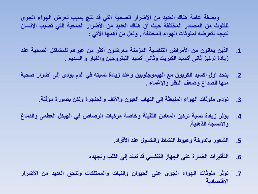 وبصفة عامة هناك العديد من الأضرار الصحية التي قد تنج بسبب تعرض الهواء الجوى للتلوث من المصادر المختلفة حيث أن هناك العديد من الأضرار الصحية التي تصيب الإنسان نتيجة لتعرضه لملوثات الهواء المختلفة , ولعل من أهمها الأتي : الذين يعانون من الأمراض التنفسية المزمنة معرضون أكثر من غيرهم للمشاكل الصحية عند زيادة تركيز ثاني أكسيد الكبريت وثاني أكسيد النيتروجين والغبار والسديم . يتحد أول أكسيد الكربون مع الهيموجلوبين وعند زيادة نسبته في الدم يؤدى إلى أضرار صحية منها الصداع وضعف النظر والإغماء . تؤدى ملوثات الهواء المنبعثة إلى التهاب العيون والأنف والحنجرة ولكن بصورة مؤقتة . يؤثر زيادة نسبة تركيز المعادن الثقيلة وخاصة مركبات الرصاص في الهيكل العظمى والدماغ والأنسجة الذهنية . الشعور بالدوخة وهبوط النشاط والخمول عند الأفراد . التأثيرات الضارة على الجهاز التنفسي قد تمتد إلى القلب وتجهده تؤثر ملوثات الهواء الجوى على الحيوان والنبات والممتلكات وتلحق العديد من الأضرار الاقتصادية
