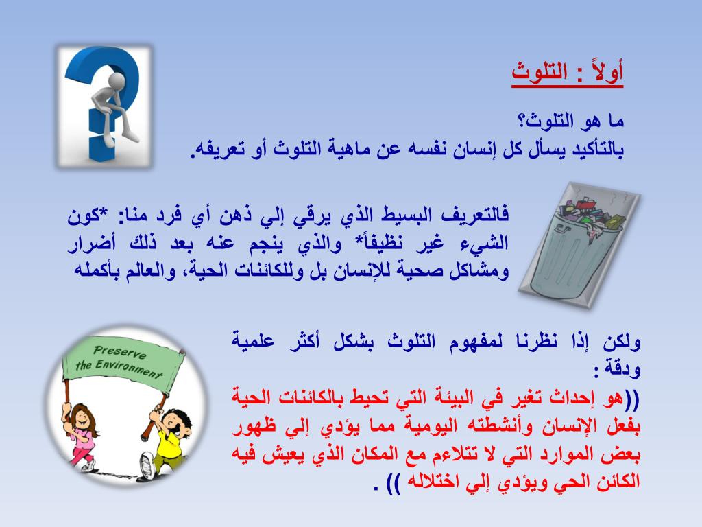 أولاً : التلوث ما هو التلوث؟ بالتأكيد يسأل كل إنسان نفسه عن ماهية التلوث أو تعريفه. فالتعريف البسيط الذي يرقي إلي ذهن أي فرد منا: *كون الشيء غير نظيفاً* والذي ينجم عنه بعد ذلك أضرار ومشاكل صحية للإنسان بل وللكائنات الحية، والعالم بأكمله ولكن إذا نظرنا لمفهوم التلوث بشكل أكثر علمية ودقة: ((هو إحداث تغير في البيئة التي تحيط بالكائنات الحية بفعل الإنسان وأنشطته اليومية مما يؤدي إلي ظهور بعض الموارد التي لا تتلاءم مع المكان الذي يعيش فيه الكائن الحي ويؤدي إلي اختلاله)) .