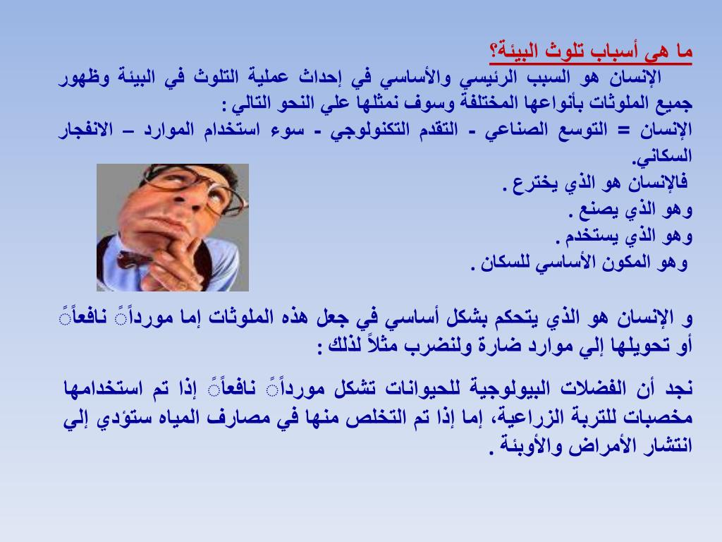 ما هي أسباب تلوث البيئة؟ الإنسان هو السبب الرئيسي والأساسي في إحداث عملية التلوث في البيئة وظهور جميع الملوثات بأنواعها المختلفة وسوف نمثلها علي النحو التالي: الإنسان = التوسع الصناعي - التقدم التكنولوجي - سوء استخدام الموارد – الانفجارالسكاني. فالإنسان هو الذي يخترع. وهو الذي يصنع. وهو الذي يستخدم. وهو المكون الأساسي للسكان. و الإنسان هو الذي يتحكم بشكل أساسي في جعل هذه الملوثات إما مورداًً نافعاًً أو تحويلها إلي موارد ضارة ولنضرب مثلاً لذلك: نجد أن الفضلات البيولوجية للحيوانات تشكل مورداًً نافعاًً إذا تم استخدامها مخصبات للتربة الزراعية، إما إذا تم التخلص منها في مصارف المياه ستؤدي إلي انتشار الأمراض والأوبئة.