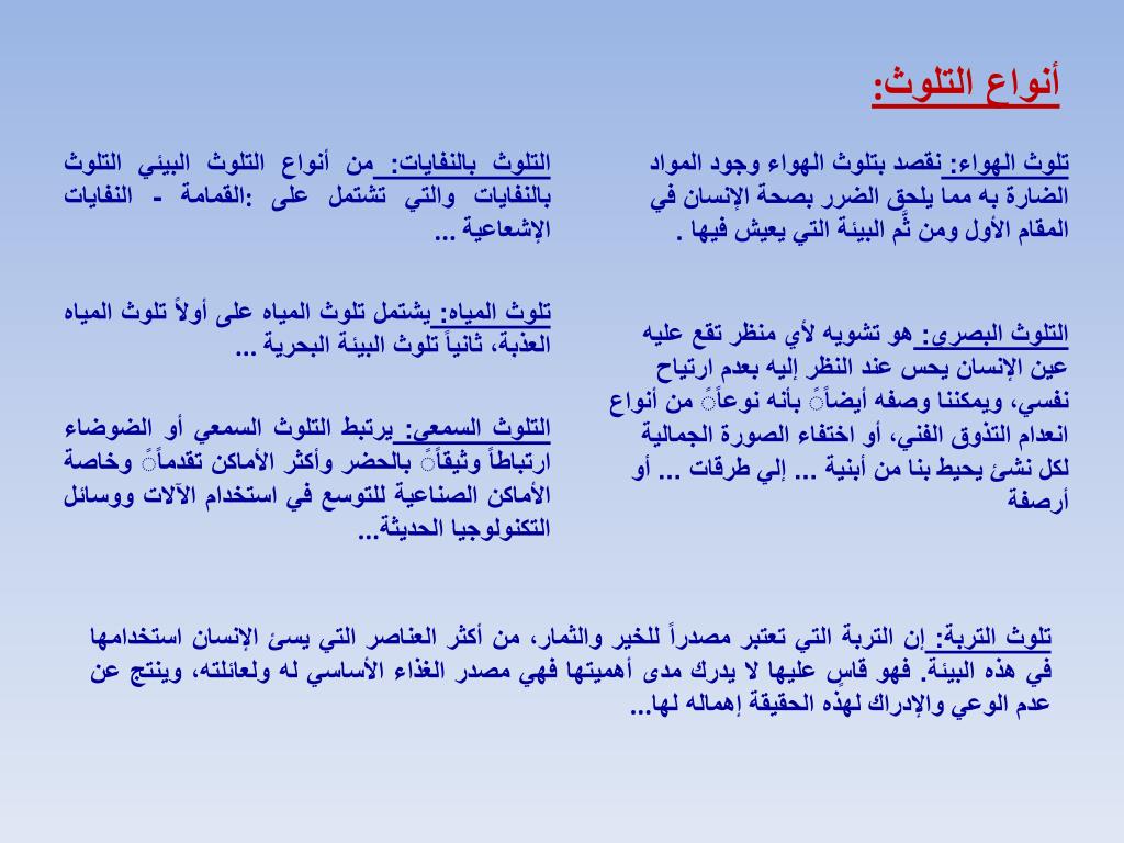أنواع التلوث: التلوث بالنفايات: من أنواع التلوث البيئي التلوث بالنفايات والتي تشتمل على: القمامة - النفايات الإشعاعية ... تلوث الهواء: نقصد بتلوث الهواء وجود المواد الضارة به مما يلحق الضرر بصحة الإنسان في المقام الأول ومن ثَّم البيئة التي يعيش فيها . تلوث المياه: يشتمل تلوث المياه على أولاً تلوث المياه العذبة، ثانياً تلوث البيئة البحرية ... التلوث البصري: هو تشويه لأي منظر تقع عليه عين الإنسان يحس عند النظر إليه بعدم ارتياح نفسي، ويمكننا وصفه أيضاًً بأنه نوعاًً من أنواع انعدام التذوق الفني، أو اختفاء الصورة الجمالية لكل نشئ يحيط بنا من أبنية ... إلي طرقات ... أو أرصفة التلوث السمعي: يرتبط التلوث السمعي أو الضوضاء ارتباطاً وثيقاًً بالحضر وأكثر الأماكن تقدماًً وخاصة الأماكن الصناعية للتوسع في استخدام الآلات ووسائل التكنولوجيا الحديثة ... تلوث التربة: إن التربة التي تعتبر مصدراً للخير والثمار، من أكثر العناصر التي يسئ الإنسان استخدامها في هذه البيئة. فهو قاسٍ عليها لا يدرك مدى أهميتها فهي مصدر الغذاء الأساسي له ولعائلته، وينتج عن عدم الوعي والإدراك لهذه الحقيقة إهماله لها ...