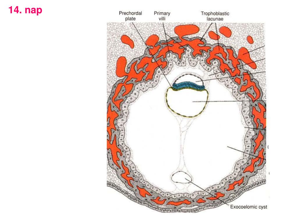 12-14.nap 1. Végleges (secunder) szikhólyag kialakulása 2. Az extraembryonális coeloma is kialakul, (körülveszi az amniont és a szikhólyagot), és az extraembrionalis mesoderma tölti ki. 3. The extraembryonic mesoderma részei: extraembryonális somatopleura az amnion körül extraembryonális splanchnopleura a szikhólyag körül 4. Primer (elsődleges) chorion bolyhok megjelenése 5. A prechordalis lemez megjelenése