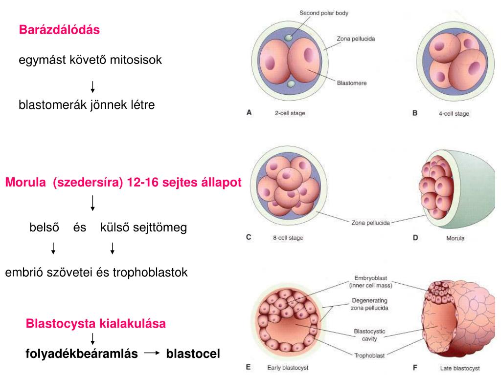 Barázdálódás egymást követő mitosisok blastomerák jönnek létre Morula (szedersíra) 12-16 sejtes állapot belső és külső sejttömeg embrió szövetei és trophoblastok Blastocysta kialakulása folyadékbeáramlás blastocel
