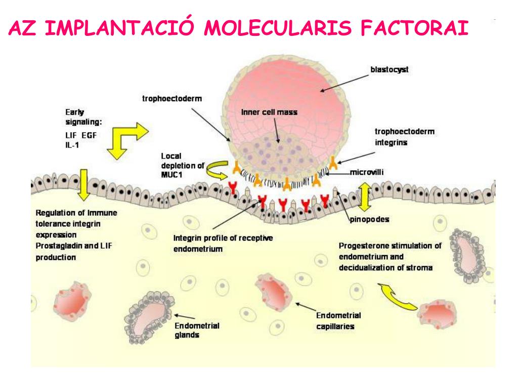 A blastocysta kapcsolódása az endometriumhoz az implantació kori szakaszában 6. nap: a trophoblastok összekapcsolódnak endometrium hámrétegével 7. nap: a trophoblastok behatolnak az endometriumba a trophoblastok proteolitikus enzimjei erodálják a méh nyálkahártyát IMPLANTÁCIÓ– beágyazódás – 11-14. napon fejeződik be.