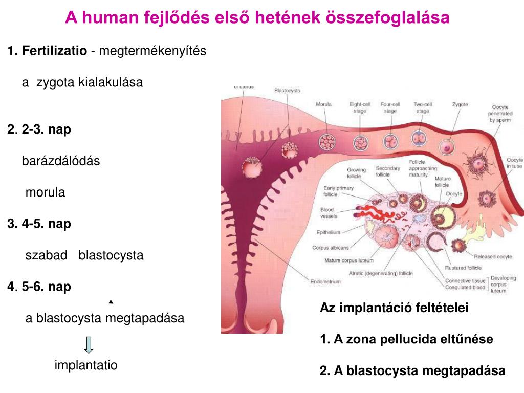 A human fejlődés első hetének összefoglalása 1. Fertilizatio - megtermékenyítés a zygota kialakulása 2. 2-3. nap barázdálódás morula 3.4-5. nap szabad blastocysta 4. 5-6. nap a blastocysta megtapadása implantatio Az implantáció feltételei 1. A zona pellucida eltűnése 2. A blastocysta megtapadása