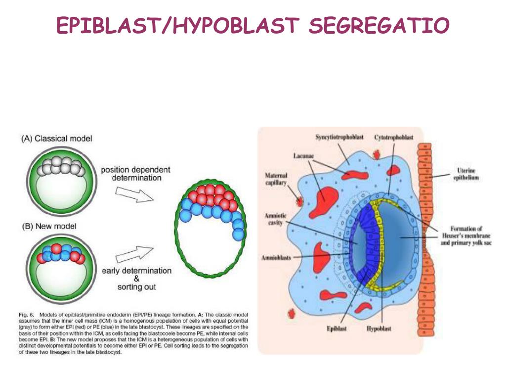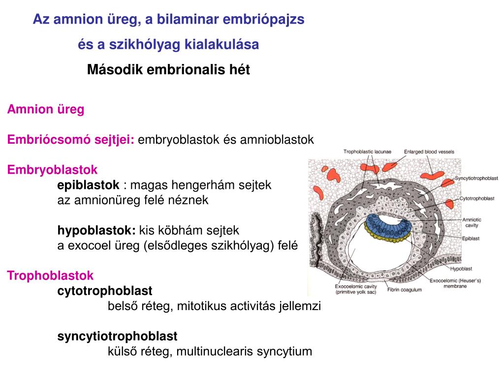 Az amnion üreg, a bilaminar embriópajzs és a szikhólyag kialakulása Második embrionalis hét Amnion üreg Embriócsomó sejtjei: embryoblastok és amnioblastok Embryoblastok epiblastok : magas hengerhám sejtek az amnionüreg felé néznek hypoblastok: kis köbhám sejtek a exocoel üreg (elsődleges szikhólyag) felé Trophoblastok cytotrophoblast belső réteg, mitotikus activitás jellemzi syncytiotrophoblast külső réteg, multinuclearis syncytium