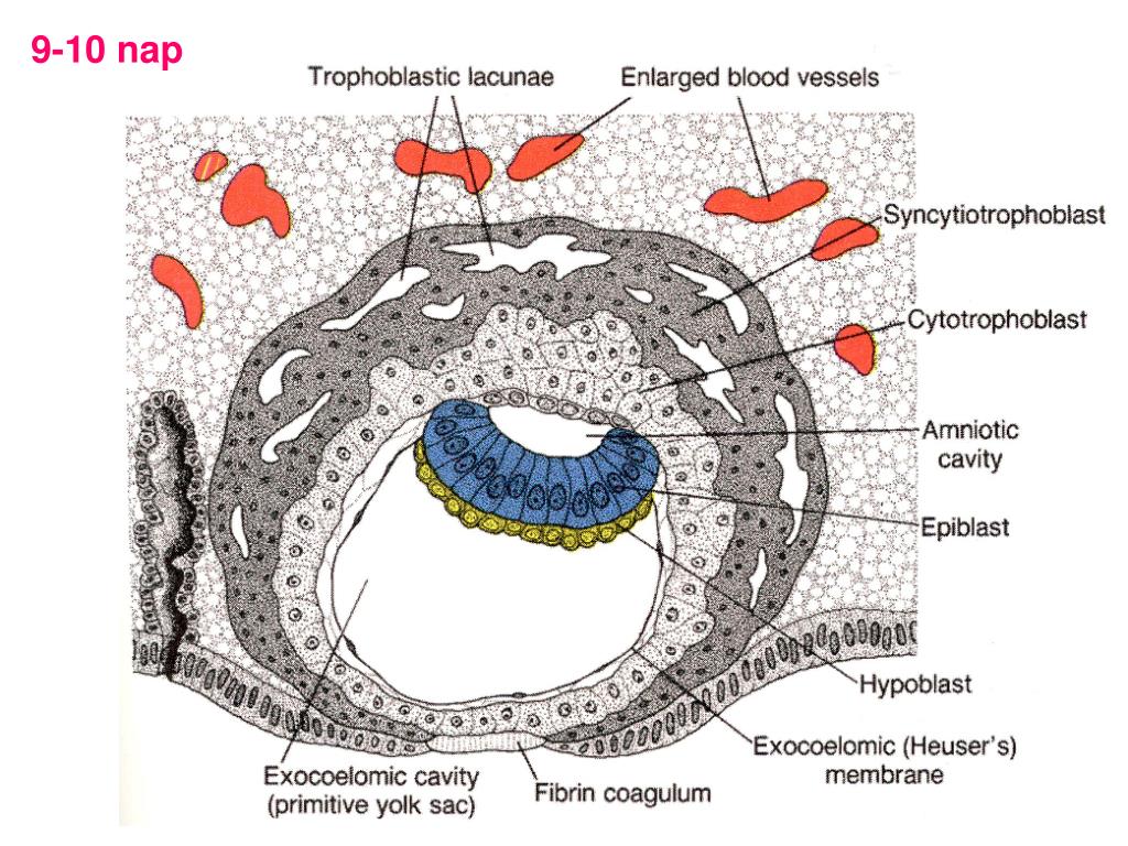 Az implantatio összefoglalása 1. A zona pellucida degenerálódik, blastocysta megnagyobbodik 2. A blastocysta kapcsolódik az endometrium hámjához 3. A trophoblastok differenciálódása. 4. A syncytiotrophoblastok erodálják az endometriumot, implantatio 5. Vérrel kitöltött lacunák jelennek meg a syncytiotrophoblastok között 6. The blastocysta beágyazódik az endometriumba epithelium hiányt fibrincoagulum zárja le