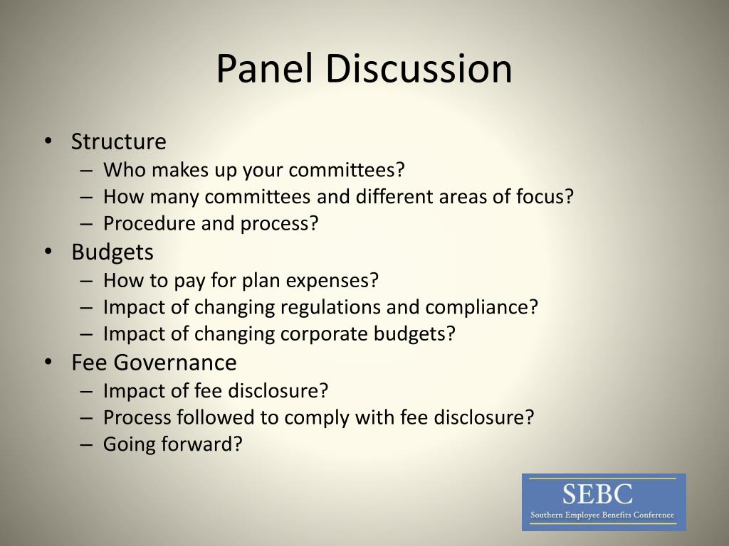 Panel Discussion • Structure • Who makes up your committees? • How many committees and different areas of focus? • Procedure and process? • Budgets • How to pay for plan expenses? • Impact of changing regulations and compliance? • Impact of changing corporate budgets? • Fee Governance • Impact of fee disclosure? • Process followed to comply with fee disclosure? • Going forward?