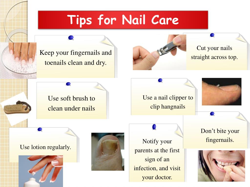 Cut your nails straight across top. Use lotion regularly. Keep your fingernails and toenails clean and dry. Notify your parents at the first sign of an infection, and visit your doctor. Use soft brush to clean under nails Tips for Nail Care Use a nail clipper to clip hangnails Don’t bite your fingernails.