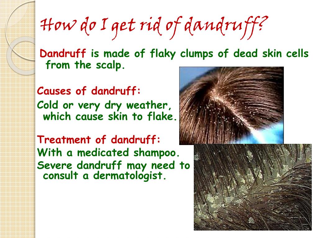 How do I get rid of dandruff? Dandruff is made of flaky clumps of dead skin cells from the scalp. Causes of dandruff: Cold or very dry weather, which cause skin to flake. Treatment of dandruff: With a medicated shampoo. Severe dandruff may need to consult a dermatologist.