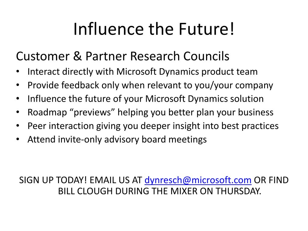 Influence the Future! Customer & Partner Research Councils • Interact directly with Microsoft Dynamics product team • Provide feedback only when relevant to you/your company • Influence the future of your Microsoft Dynamics solution • Roadmap “previews” helping you better plan your business • Peer interaction giving you deeper insight into best practices • Attend invite-only advisory board meetings SIGN UP TODAY! EMAIL US AT dynresch@microsoft.com OR FIND BILL CLOUGH DURING THE MIXER ON THURSDAY.