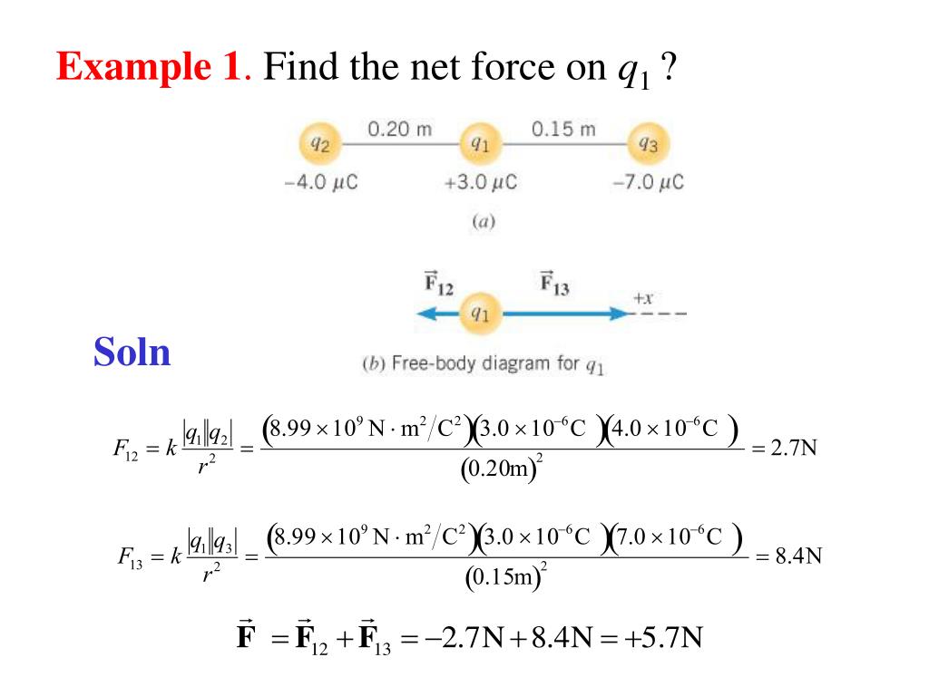 Example 2. Find the net force on q3 ? • The force exerted by q1 on q3 is • The force exerted by q2 on q3 is • The resultant force exerted on q3 is the vector sum of and