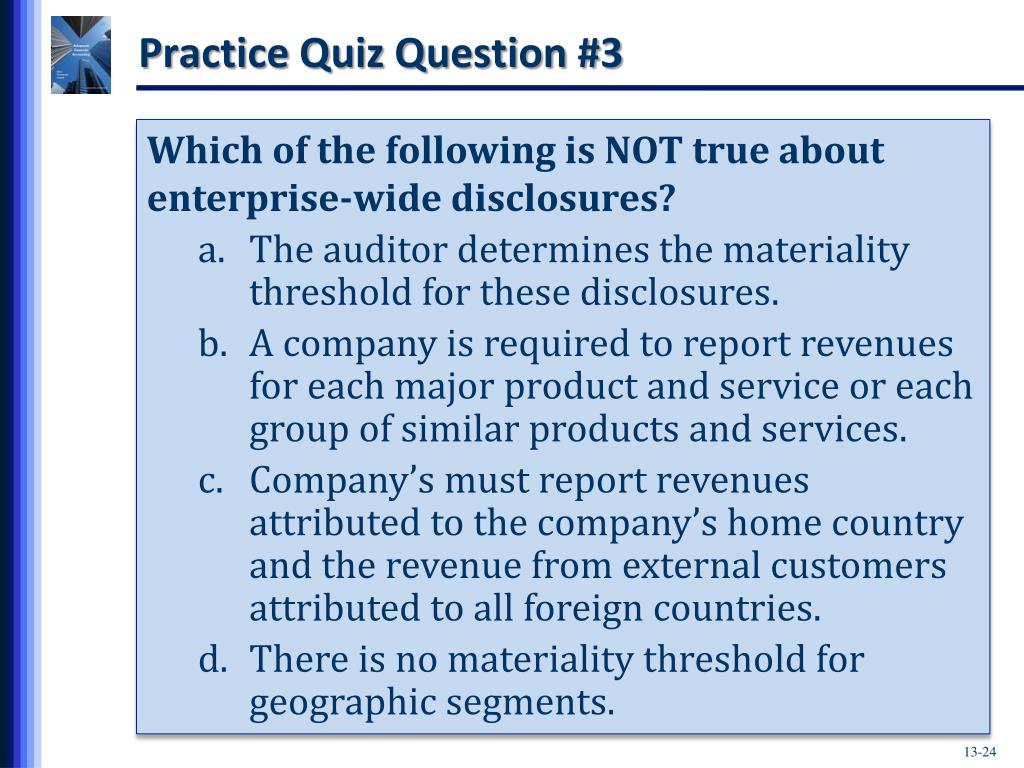 Practice Quiz Question #3 Which of the following is NOT true about enterprise-wide disclosures? a. The auditor determines the materiality threshold for these disclosures. b. A company is required to report revenues for each major product and service or each group of similar products and services. c. Company’s must report revenues attributed to the company’s home country and the revenue from external customers attributed to all foreign countries. • d. There is no materiality threshold for geographic segments.