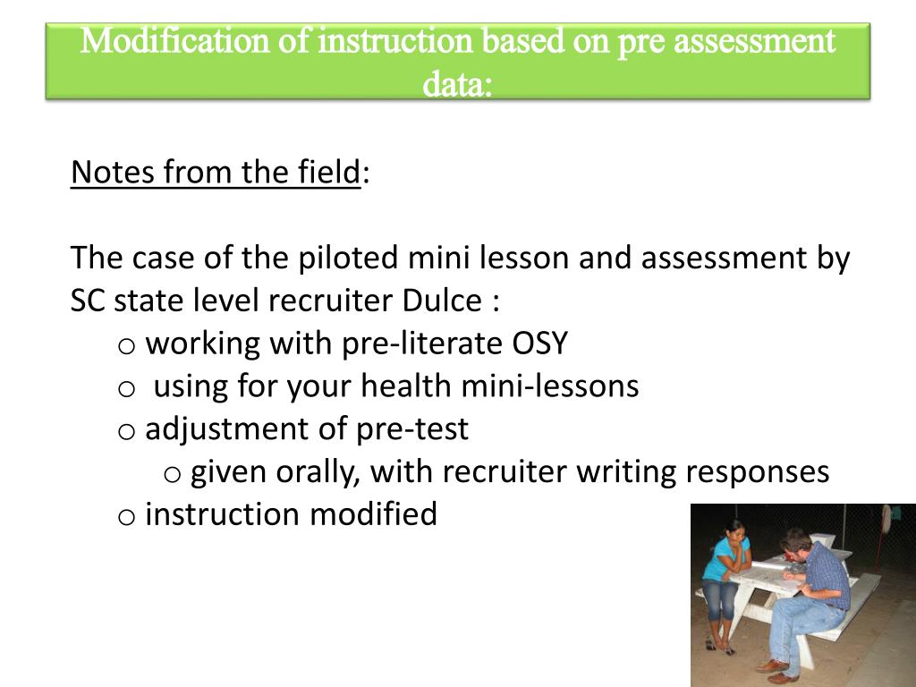 Modification of instruction based on pre assessment data: • Notes from the field: • The case of the piloted mini lesson and assessment by SC state level recruiter Dulce : • working with pre-literate OSY • using for your health mini-lessons • adjustment of pre-test • given orally, with recruiter writing responses • instruction modified