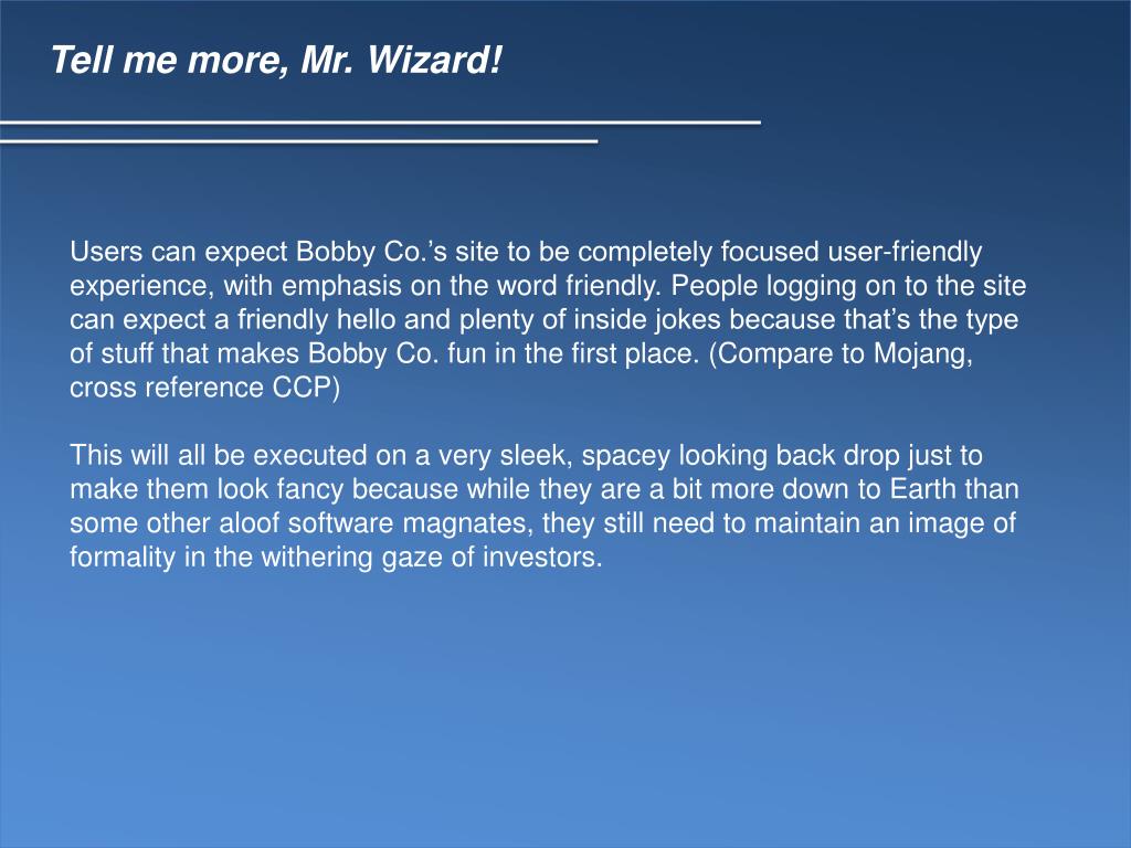 Tell me more, Mr. Wizard! Users can expect Bobby Co.’s site to be completely focused user-friendly experience, with emphasis on the word friendly. People logging on to the site can expect a friendly hello and plenty of inside jokes because that’s the type of stuff that makes Bobby Co. fun in the first place. (Compare to Mojang, cross reference CCP) This will all be executed on a very sleek, spacey looking back drop just to make them look fancy because while they are a bit more down to Earth than some other aloof software magnates, they still need to maintain an image of formality in the withering gaze of investors.