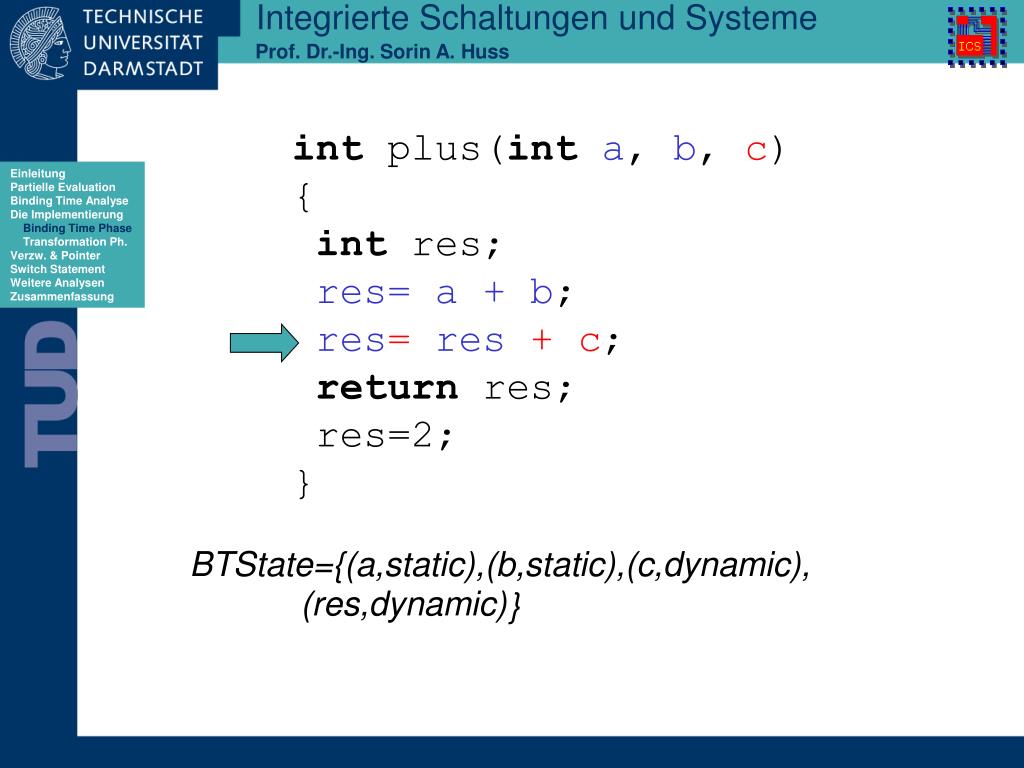 int plus(inta, b, c) { int res; res= a + b; res= res + c; return res; res=2; } Einleitung Partielle Evaluation Binding Time Analyse Die Implementierung Binding Time Phase Transformation Ph. Verzw. & Pointer Switch Statement Weitere Analysen Zusammenfassung BTState={(a,static),(b,static),(c,dynamic)}