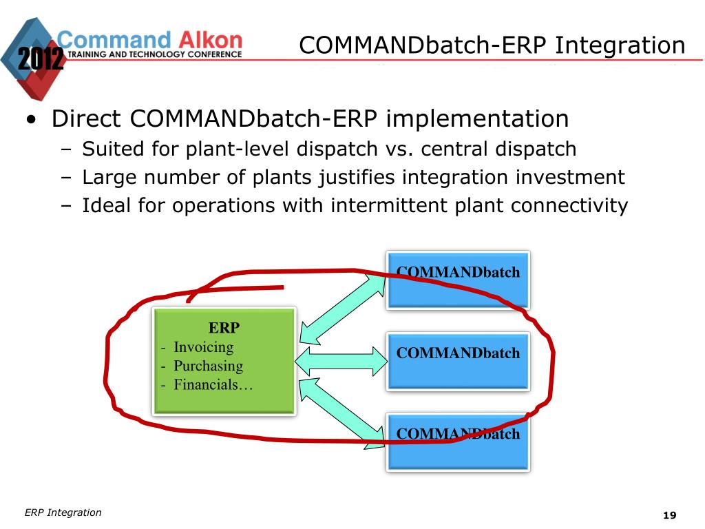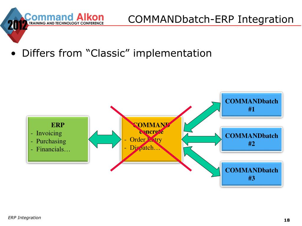 COMMANDbatch-ERP Integration • Differs from “Classic” implementation COMMANDbatch#1 ERP - Invoicing - Purchasing - Financials… COMMAND concrete - Order Entry - Dispatch… COMMANDbatch#2 COMMANDbatch#3 ERP Integration