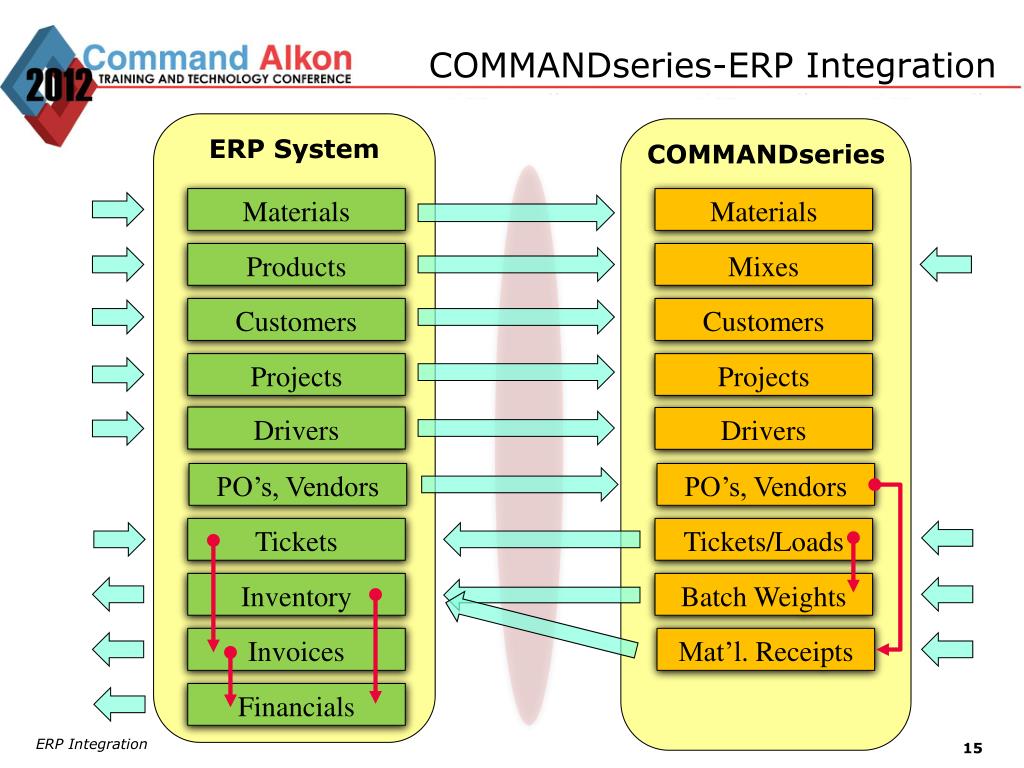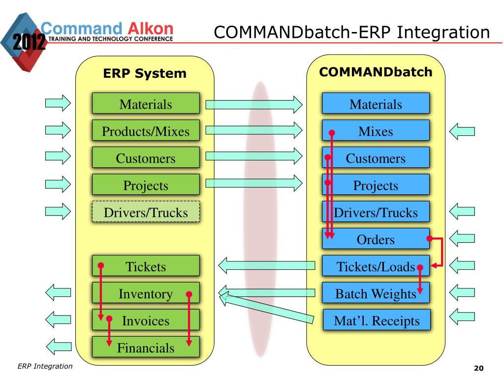 COMMANDbatch-ERP Integration COMMANDbatch ERP System Materials Materials Products/Mixes Mixes Customers Customers Projects Projects Drivers/Trucks Drivers/Trucks Orders Tickets Tickets/Loads Inventory Batch Weights Invoices Mat’l. Receipts Financials ERP Integration