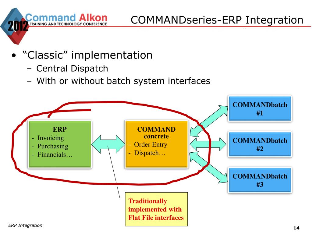COMMANDseries-ERP Integration • “Classic” implementation • Central Dispatch • With or without batch system interfaces COMMANDbatch#1 ERP - Invoicing - Purchasing - Financials… COMMAND concrete - Order Entry - Dispatch… COMMANDbatch#2 COMMANDbatch#3 Traditionally implemented with Flat File interfaces ERP Integration