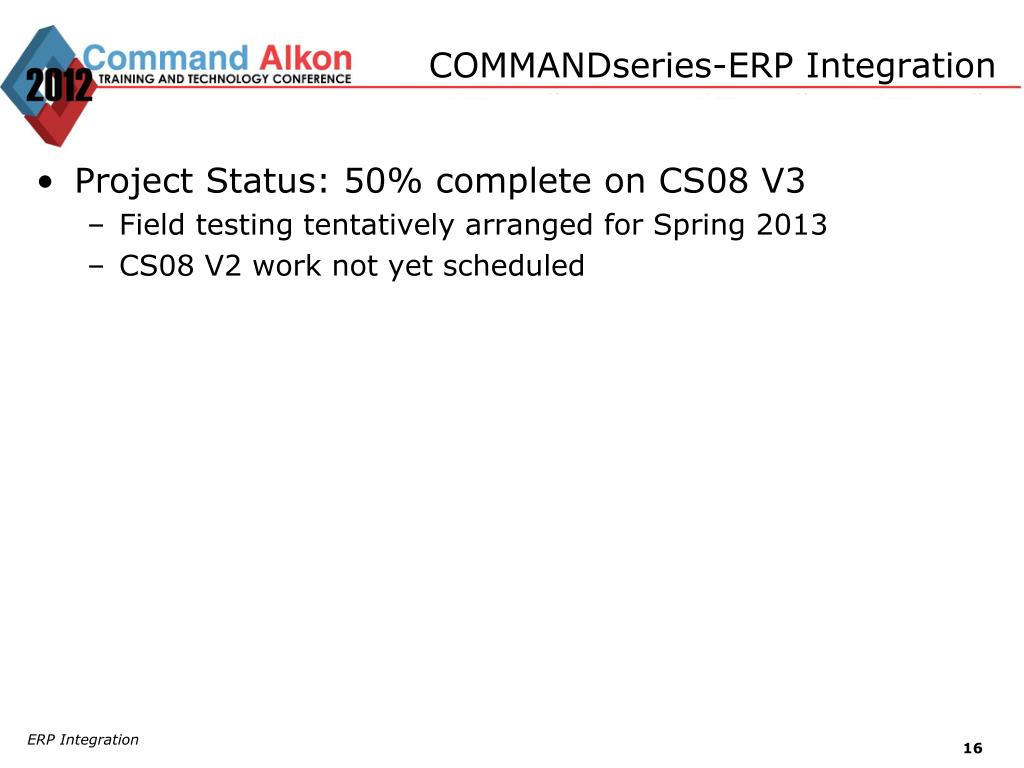 COMMANDseries-ERP Integration • Project Status: 50% complete on CS08 V3 • Field testing tentatively arranged for Spring 2013 • CS08 V2 work not yet scheduled ERP Integration