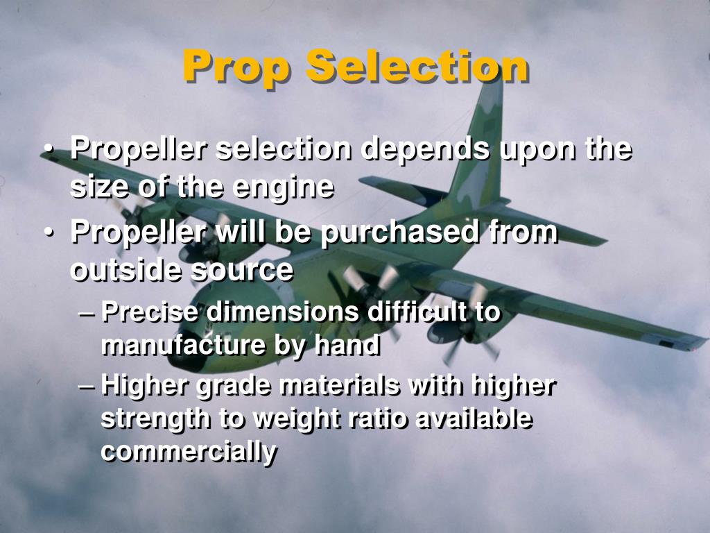 Prop Selection • Propeller selection depends upon the size of the engine • Propeller will be purchased from outside source • Precise dimensions difficult to manufacture by hand • Higher grade materials with higher strength to weight ratio available commercially