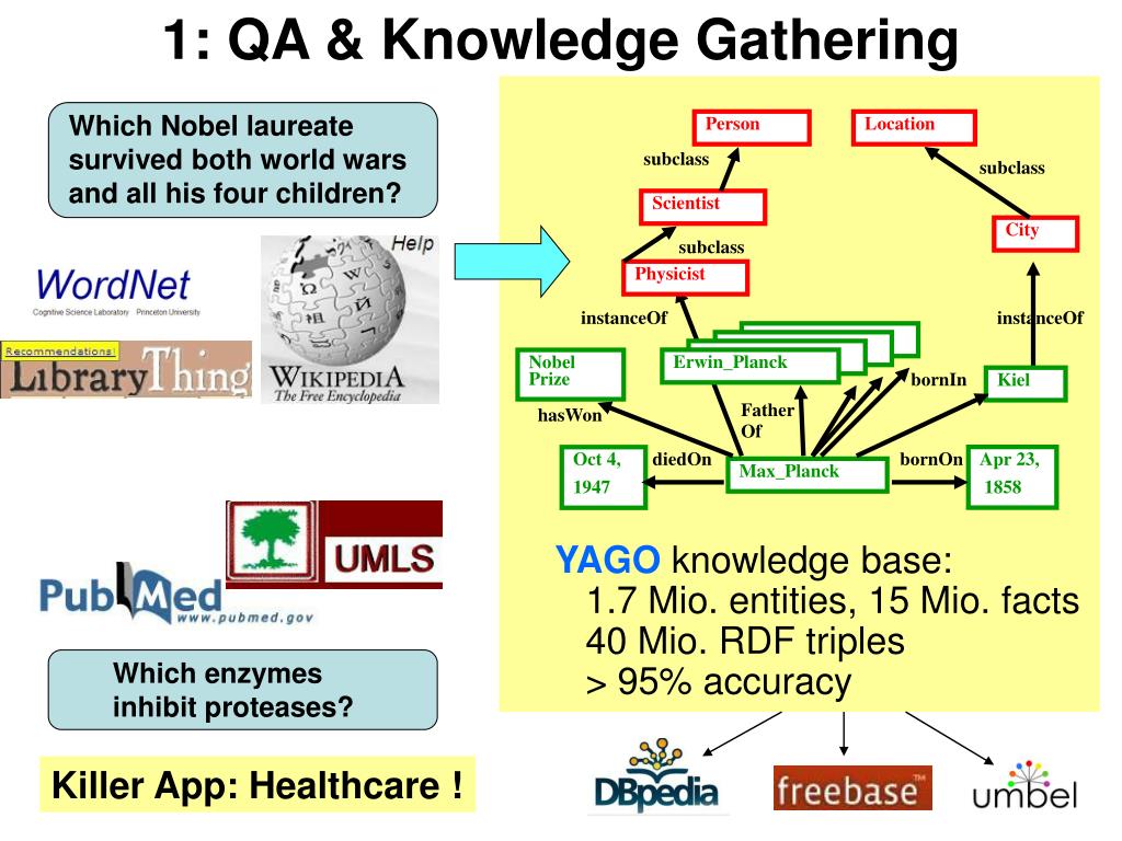 1: QA & Knowledge Gathering Person Location subclass subclass Scientist City subclass Physicist instanceOf instanceOf Erwin_Planck Nobel Prize bornIn Kiel hasWon Father Of bornOn Apr 23, 1858 Oct 4, 1947 diedOn Max_Planck YAGO knowledge base: 1.7 Mio. entities, 15 Mio. facts 40 Mio. RDF triples > 95% accuracy Which enzymes inhibit proteases? Killer App: Healthcare ! Which Nobel laureate survived both world wars and all his four children?