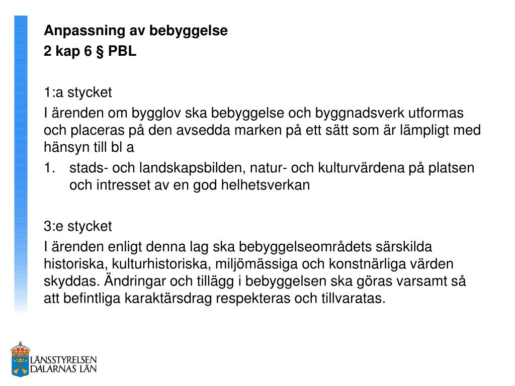 Anpassning av bebyggelse 2 kap 6 § PBL 1:a stycket I ärenden om bygglov ska bebyggelse och byggnadsverk utformas och placeras på den avsedda marken på ett sätt som är lämpligt med hänsyn till bl a • stads- och landskapsbilden, natur- och kulturvärdena på platsen och intresset av en god helhetsverkan 3:e stycket I ärenden enligt denna lag ska bebyggelseområdets särskilda historiska, kulturhistoriska, miljömässiga och konstnärliga värden skyddas. Ändringar och tillägg i bebyggelsen ska göras varsamt så att befintliga karaktärsdrag respekteras och tillvaratas.