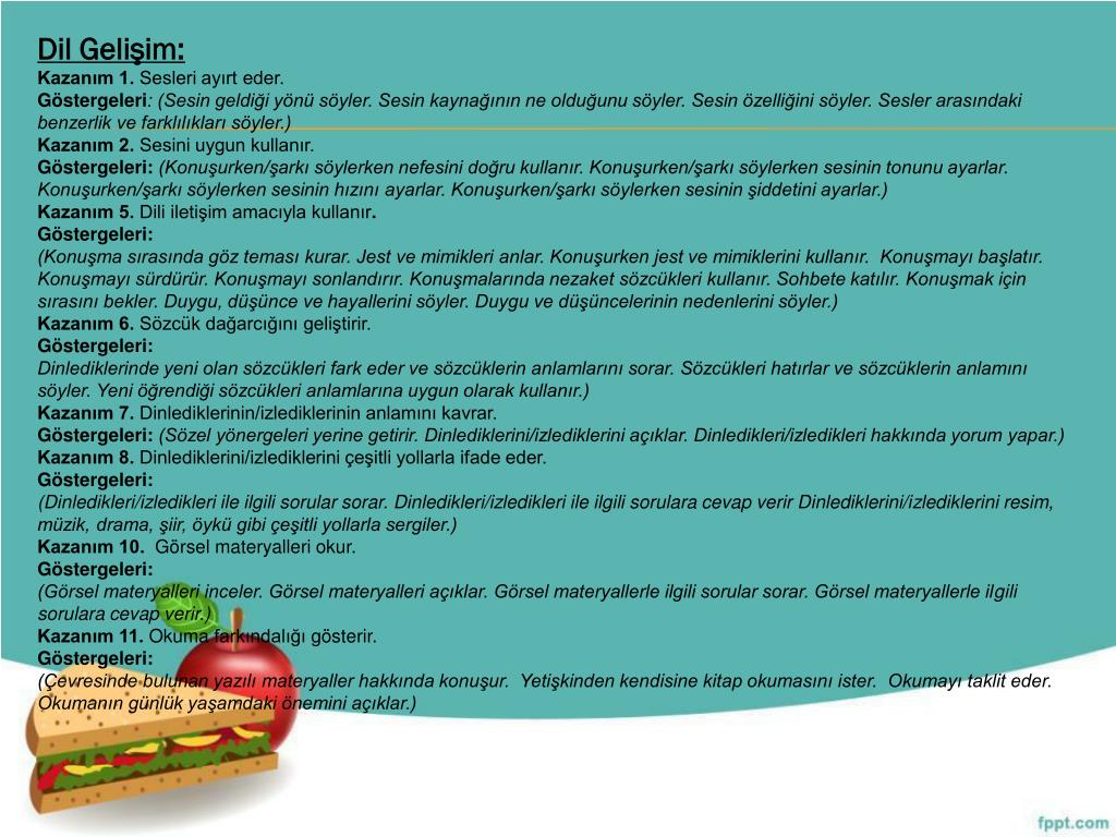 Dil Gelişim: Kazanım 1. Sesleri ayırt eder. Göstergeleri: (Sesin geldiği yönü söyler. Sesin kaynağının ne olduğunu söyler. Sesin özelliğini söyler. Sesler arasındaki benzerlik ve farklılıkları söyler.) Kazanım 2. Sesini uygun kullanır. Göstergeleri: (Konuşurken/şarkı söylerken nefesini doğru kullanır. Konuşurken/şarkı söylerken sesinin tonunu ayarlar. Konuşurken/şarkı söylerken sesinin hızını ayarlar. Konuşurken/şarkı söylerken sesinin şiddetini ayarlar.) Kazanım 5. Dili iletişim amacıyla kullanır. Göstergeleri: (Konuşma sırasında göz teması kurar. Jest ve mimikleri anlar. Konuşurken jest ve mimiklerini kullanır. Konuşmayı başlatır. Konuşmayı sürdürür. Konuşmayı sonlandırır. Konuşmalarında nezaket sözcükleri kullanır. Sohbete katılır. Konuşmak için sırasını bekler. Duygu, düşünce ve hayallerini söyler. Duygu ve düşüncelerinin nedenlerini söyler.) Kazanım 6. Sözcük dağarcığını geliştirir. Göstergeleri: Dinlediklerinde yeni olan sözcükleri fark eder ve sözcüklerin anlamlarını sorar. Sözcükleri hatırlar ve sözcüklerin anlamını söyler. Yeni öğrendiği sözcükleri anlamlarına uygun olarak kullanır.) Kazanım 7. Dinlediklerinin/izlediklerinin anlamını kavrar. Göstergeleri: (Sözel yönergeleri yerine getirir. Dinlediklerini/izlediklerini açıklar. Dinledikleri/izledikleri hakkında yorum yapar.) Kazanım 8. Dinlediklerini/izlediklerini çeşitli yollarla ifade eder. Göstergeleri: (Dinledikleri/izledikleri ile ilgili sorular sorar. Dinledikleri/izledikleri ile ilgili sorulara cevap verir Dinlediklerini/izlediklerini resim, müzik, drama, şiir, öykü gibi çeşitli yollarla sergiler.) Kazanım 10. Görsel materyalleri okur. Göstergeleri: (Görsel materyalleri inceler. Görsel materyalleri açıklar. Görsel materyallerle ilgili sorular sorar. Görsel materyallerle ilgili sorulara cevap verir.) Kazanım 11. Okuma farkındalığı gösterir. Göstergeleri: (Çevresinde bulunan yazılı materyaller hakkında konuşur. Yetişkinden kendisine kitap okumasını ister. Okumayı taklit eder. Okumanın günlük yaşamdaki önemini açıklar.)